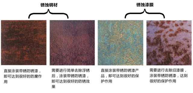 一般的銹蝕鋼材需要噴砂或打磨處理后才能進行油漆涂裝,噴砂打磨耗時大,成本高,采用帶銹防銹漆即可解決以上問題。